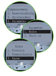 Under kjøpmannsmenyens menyvalg Parametre + Endre + Kasse finnes det innstillinger som er viktige for at terminalen skal kunne kommunisere med kassen. Får å endre en innstilling, trykker du deg frem til innstillingen, trykker OK-knappen, trykker pil ned og bekrefter valget med OK-knappen.