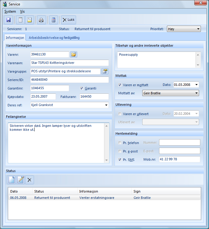 Service er et komplett system for verksteder og bedrifter som tar inn varer for service eller reparasjon. Hold kontroll på all service som er ventet inn, er innlevert, videresendt og utlevert.